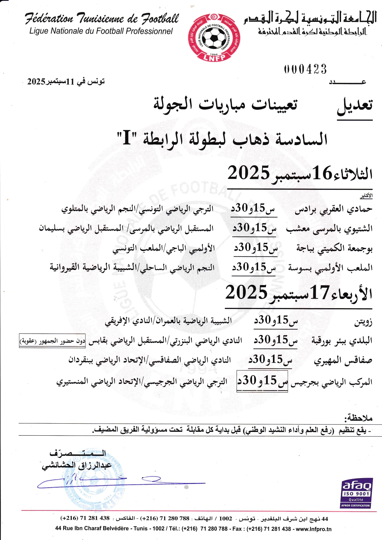 تعديل تعيينات مباريات الجولة السادسة ذهاب لبطولة الرابطة « I »