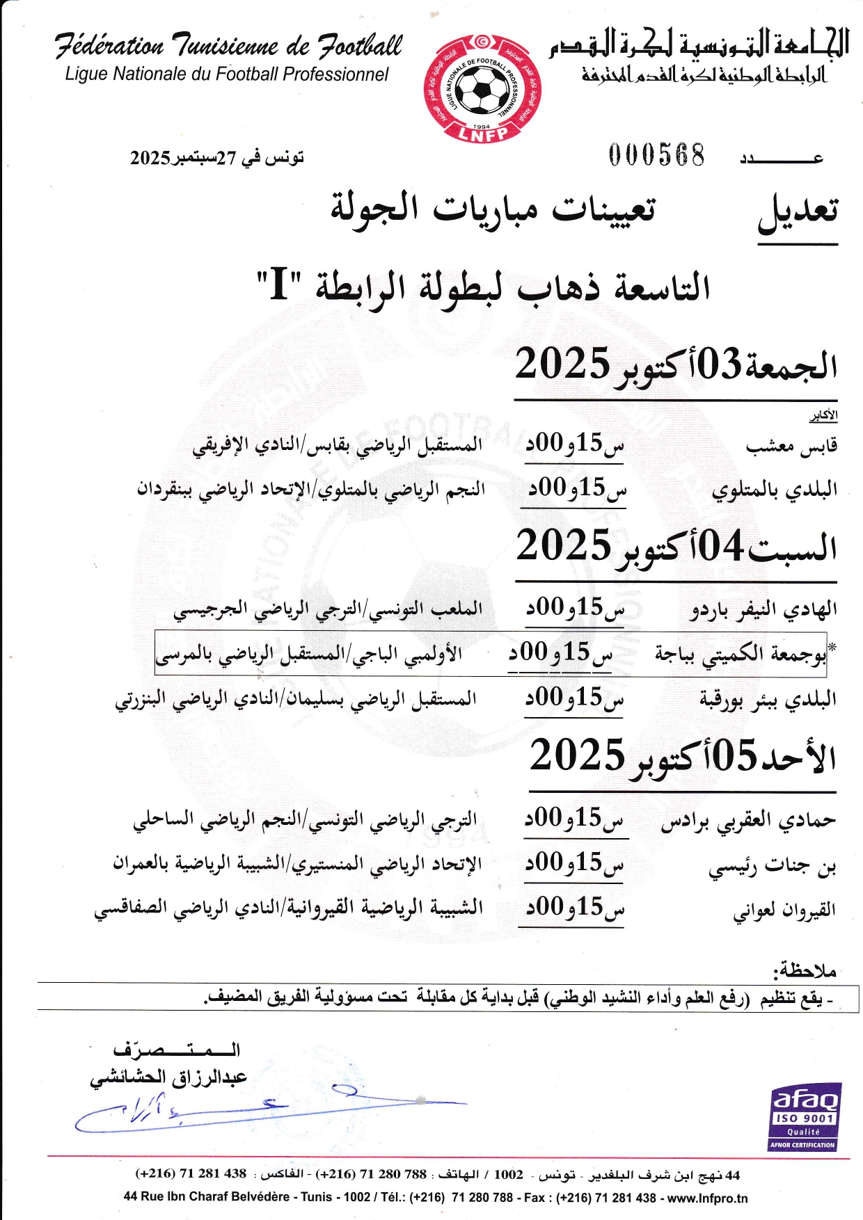 تعديل تعيينات مباريات الجولة 9 ذهاب لبطولة الرابطة « I »