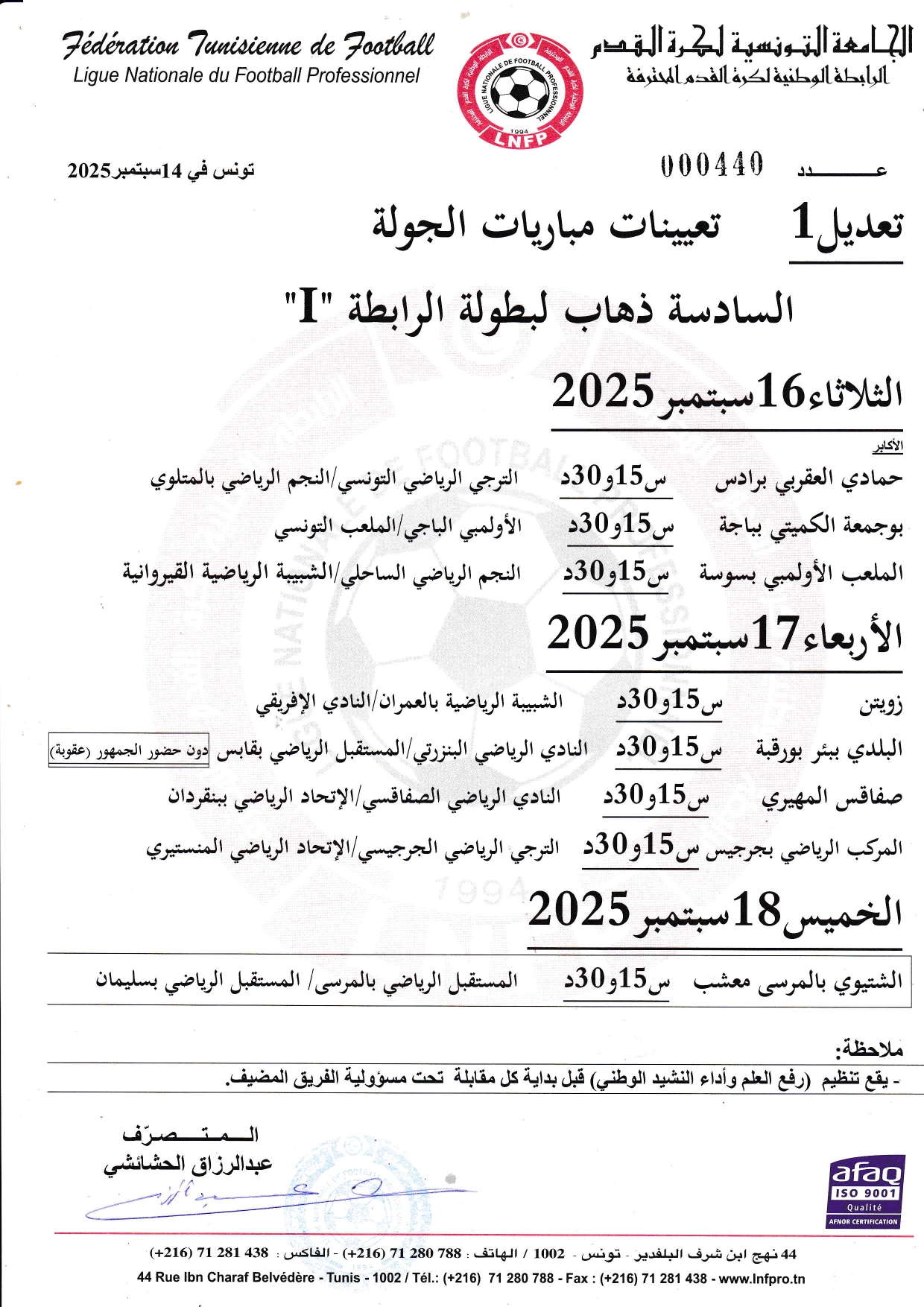 تعديل تعيينات مباريات الجولة 9 ذهاب لبطولة الرابطة « I »