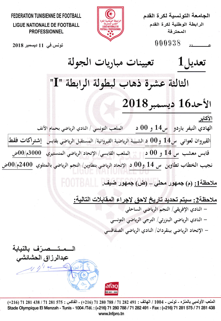 تعديل تعيينات مباريات الجولة 9 ذهاب لبطولة الرابطة « I »
