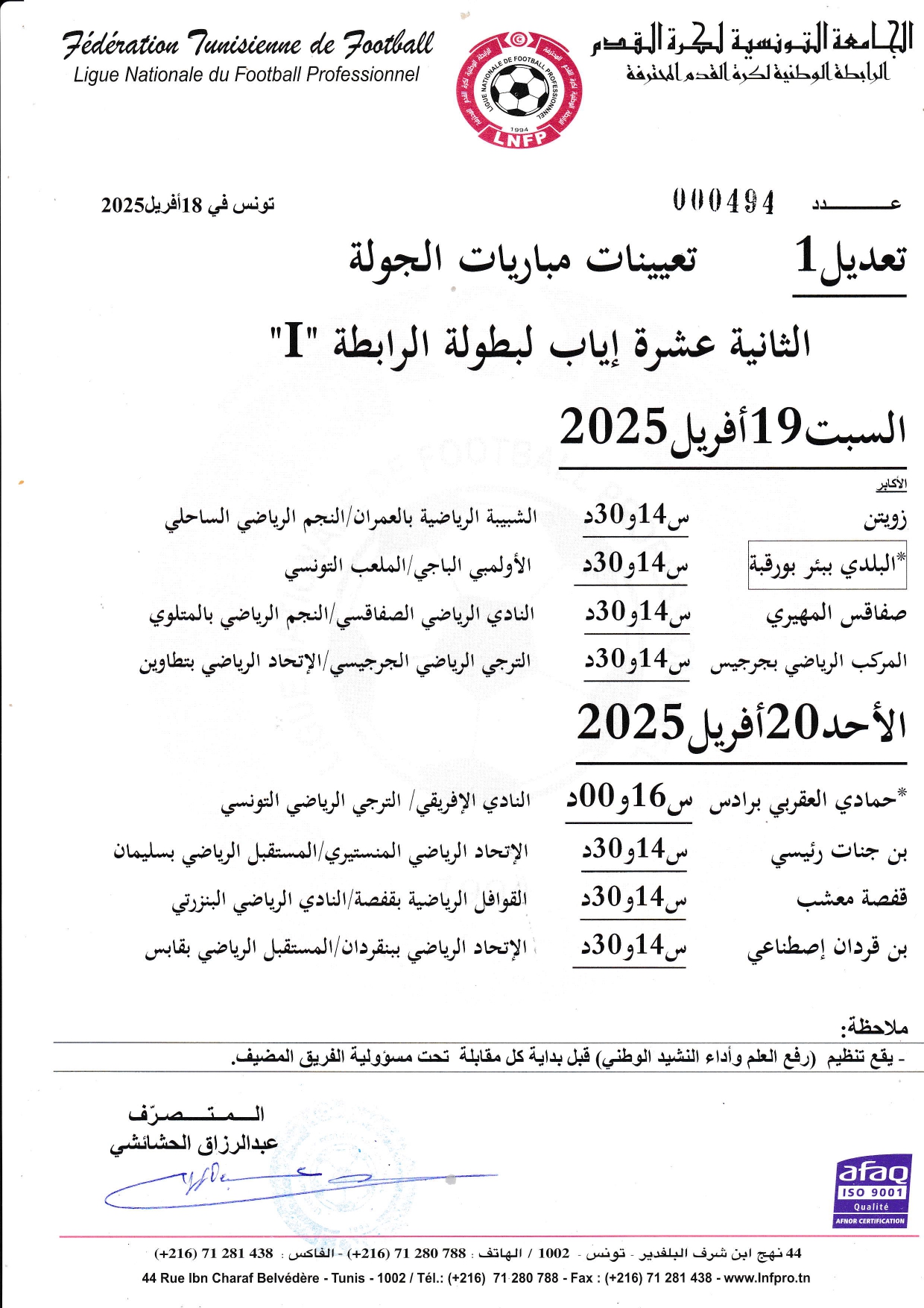 تعديل تعيينات مباريات الجولة 9 ذهاب لبطولة الرابطة « I »