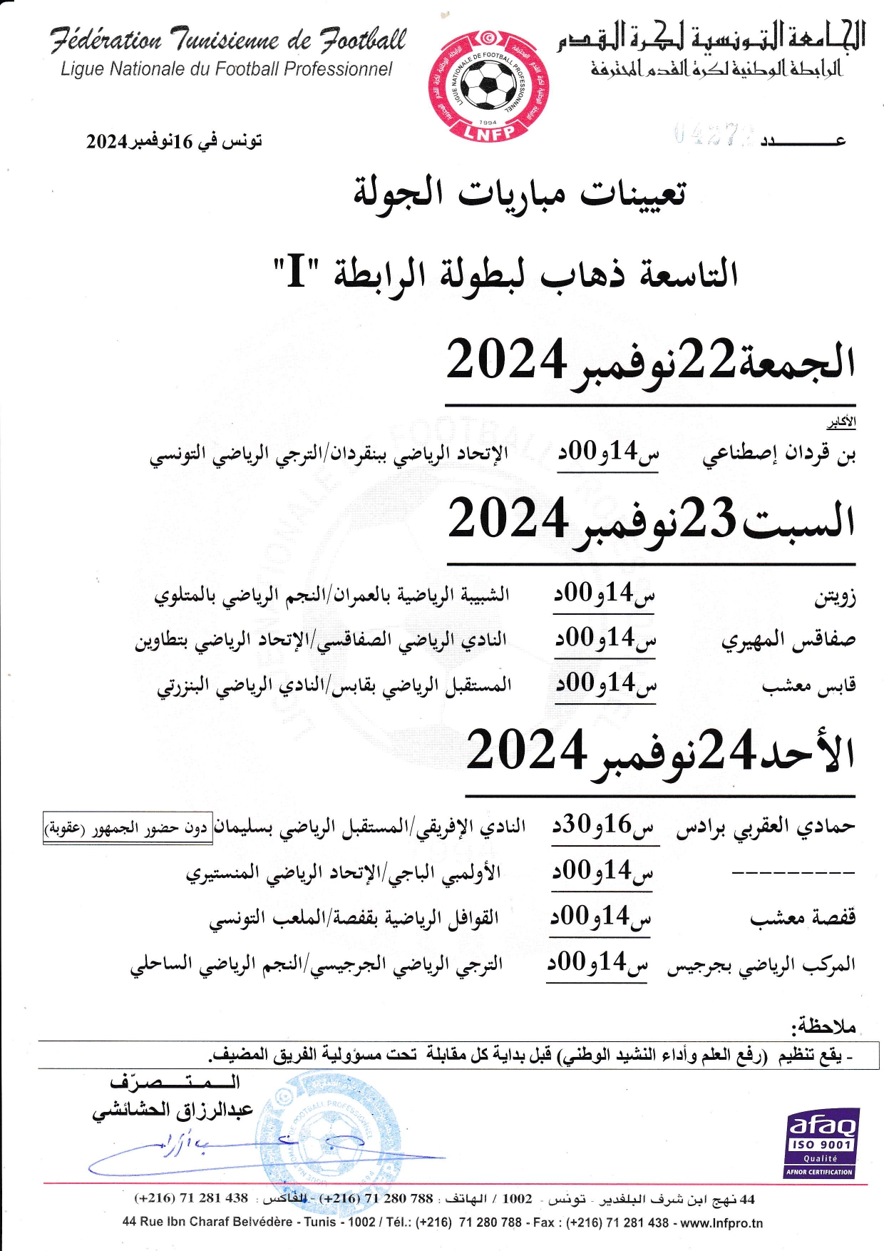 تعيينات مباريات الجولة 9 ذهاب لبطولة الرابطة « I »