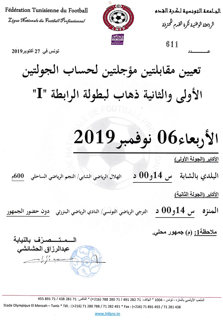تعيين مباراة مؤجلة لحساب الجولة الاولى و الثانية ذهاب لبطولة الرابطة 1