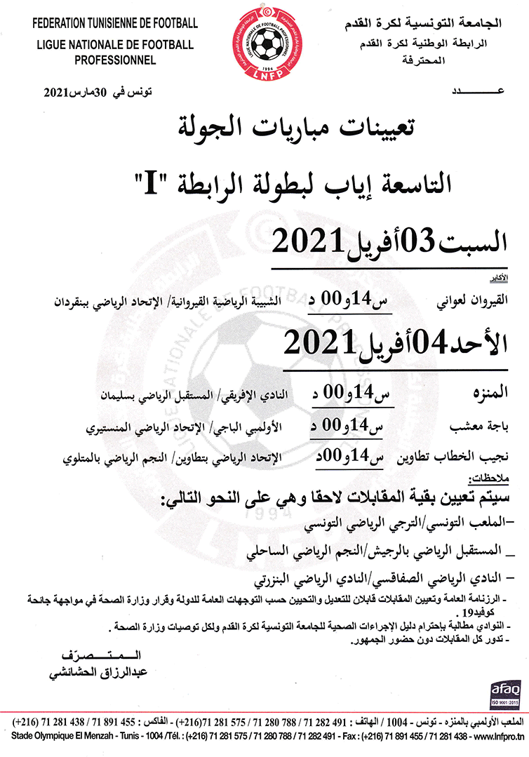 تعيينات مباريات الجولة التاسعة إياب لبطولة الرابطة 1