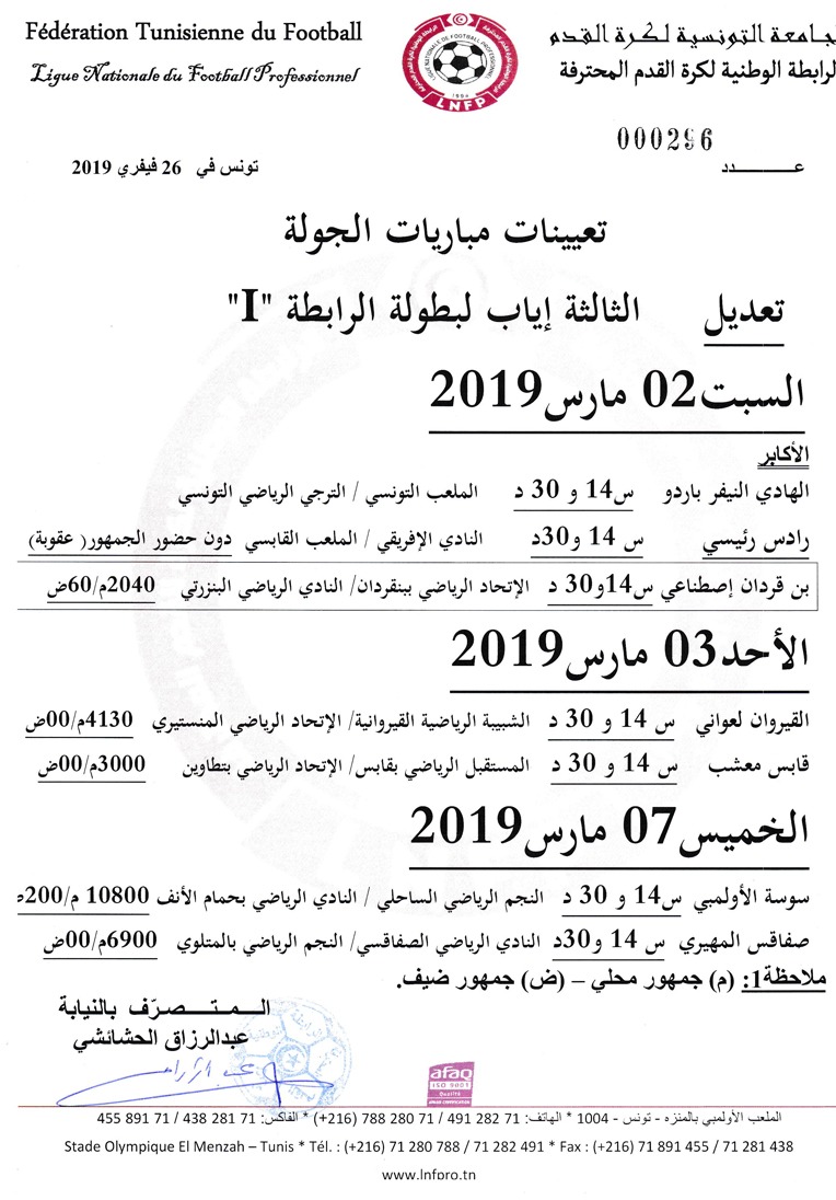 تعديل تعيينات مباريات الجولة 9 ذهاب لبطولة الرابطة « I »