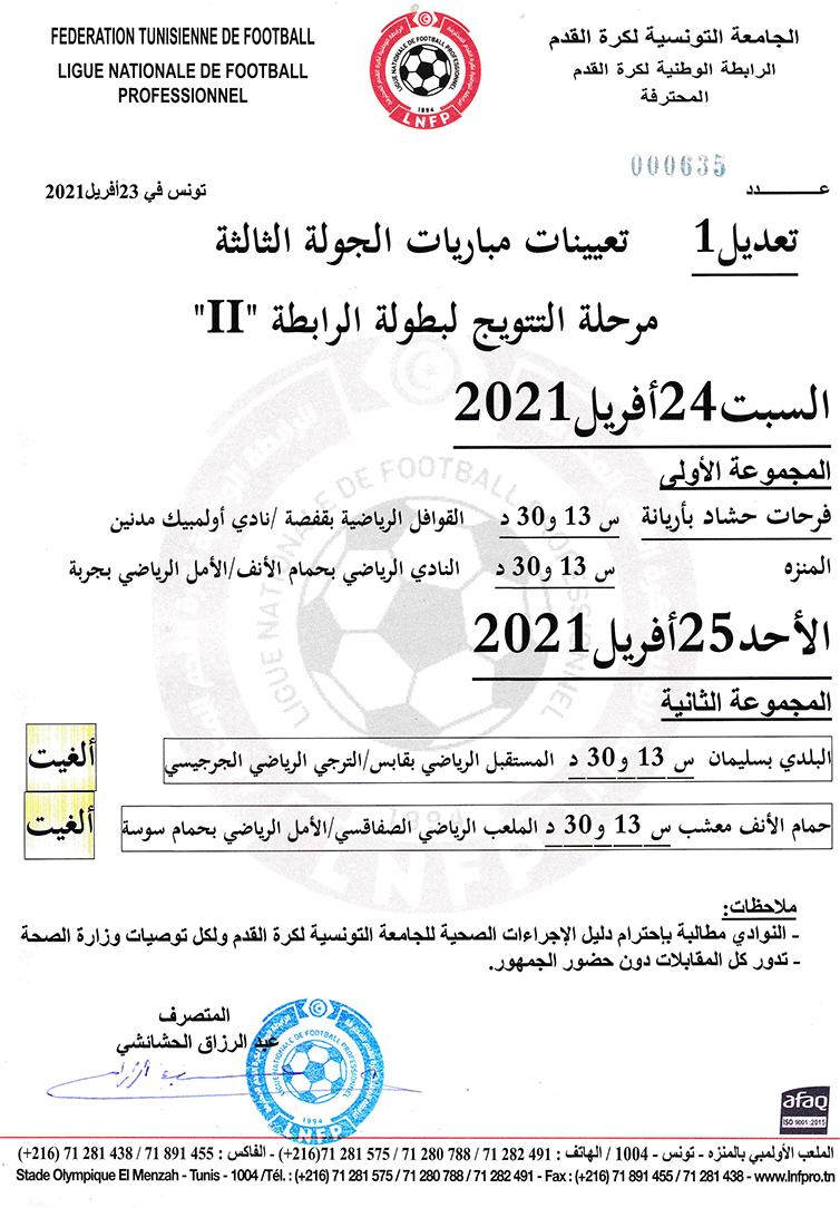 تعديل تعيينات مباريات الجولة 9 ذهاب لبطولة الرابطة « I »