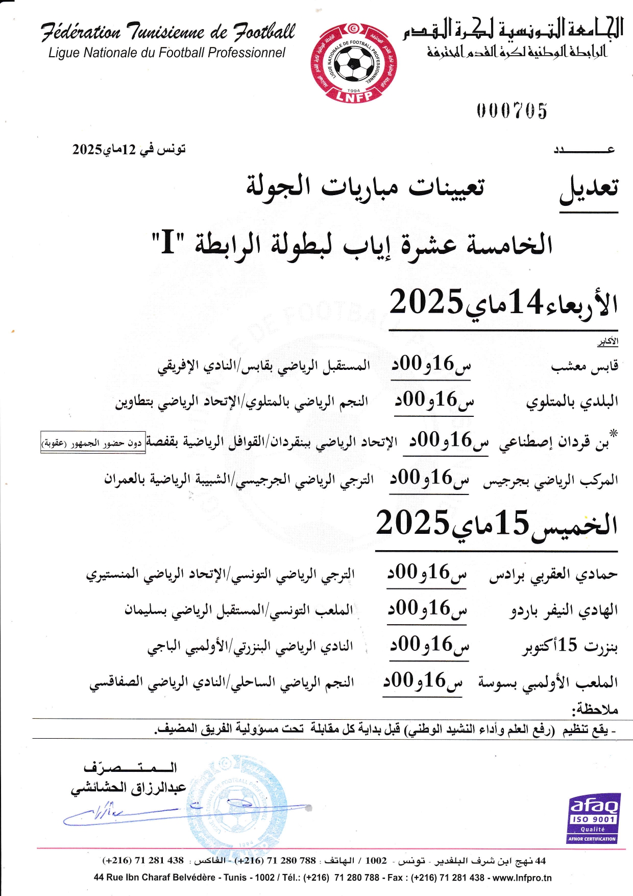 تعديل تعيينات مباريات الجولة 9 ذهاب لبطولة الرابطة « I »