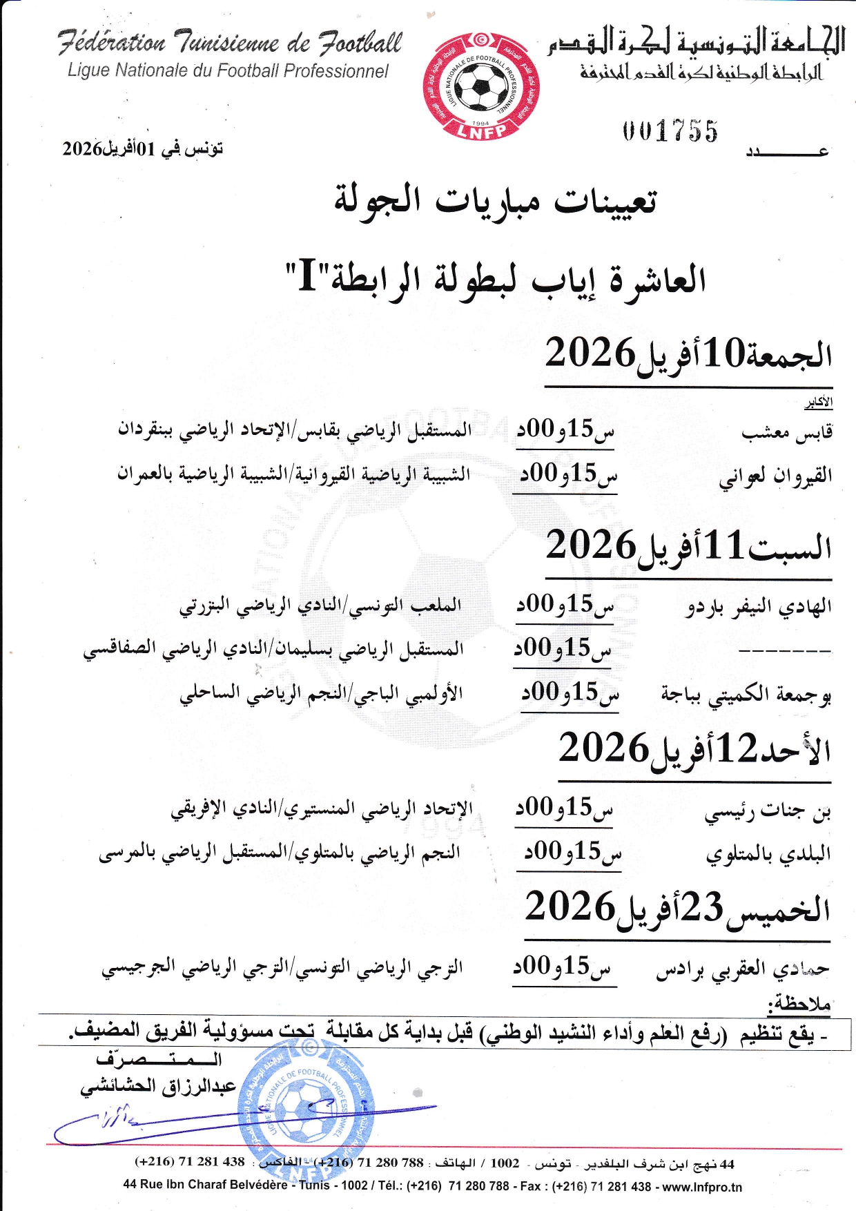 تعيينات مباريات الجولة العاشرة إياب لبطولة الرابطة « I »