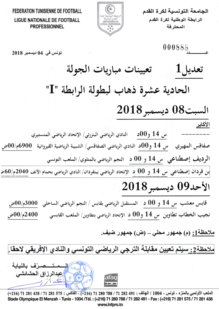 تعديل تعيينات مباريات الجولة 9 ذهاب لبطولة الرابطة « I »
