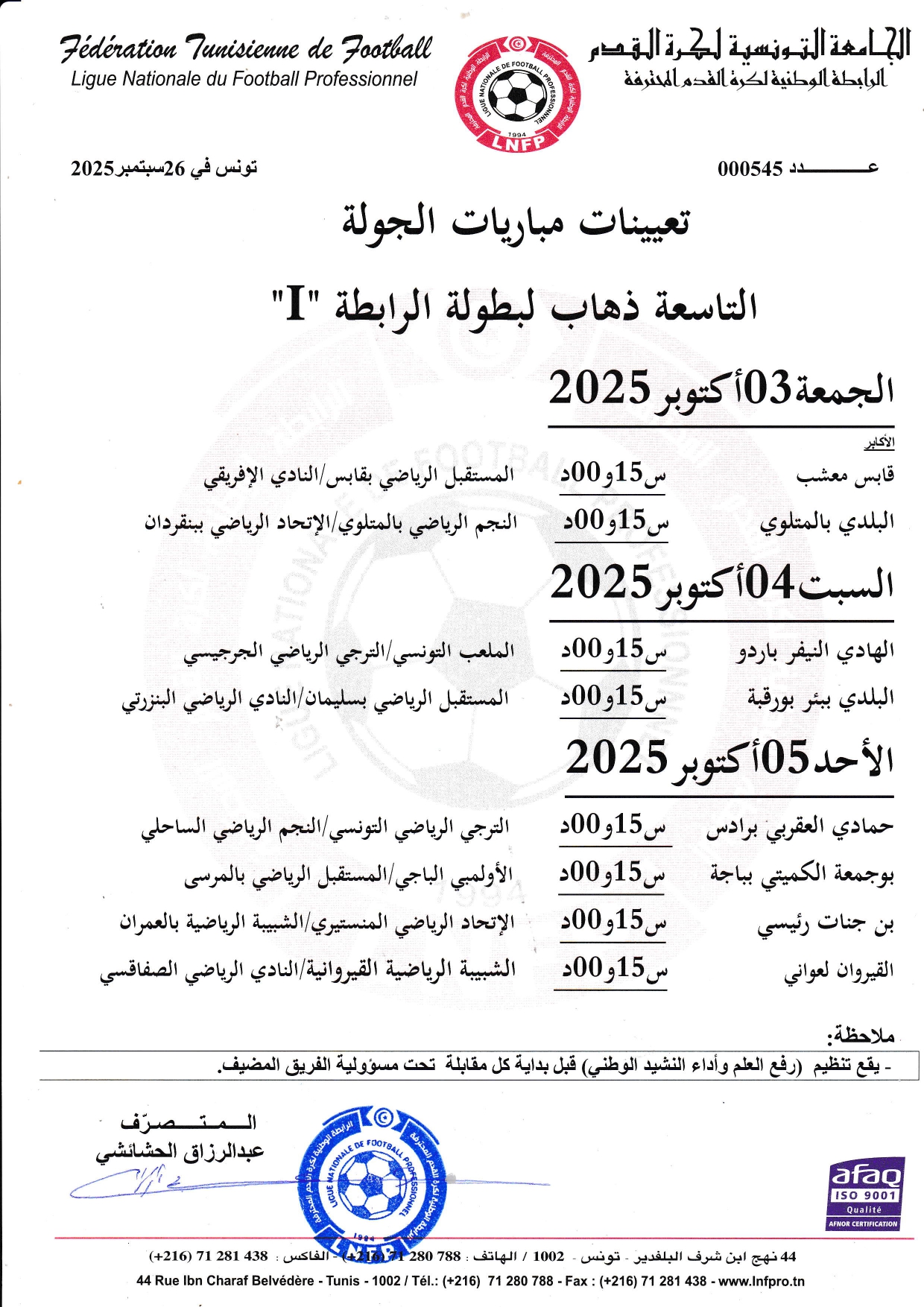 تعيينات مباريات الجولة 9 ذهاب لبطولة الرابطة « I »