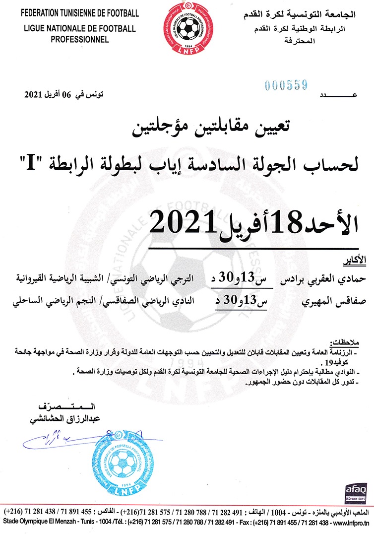 1 تعيينات مباريات مؤجلة لحساب الجولة السادسة إياب لبطولة الرابطة