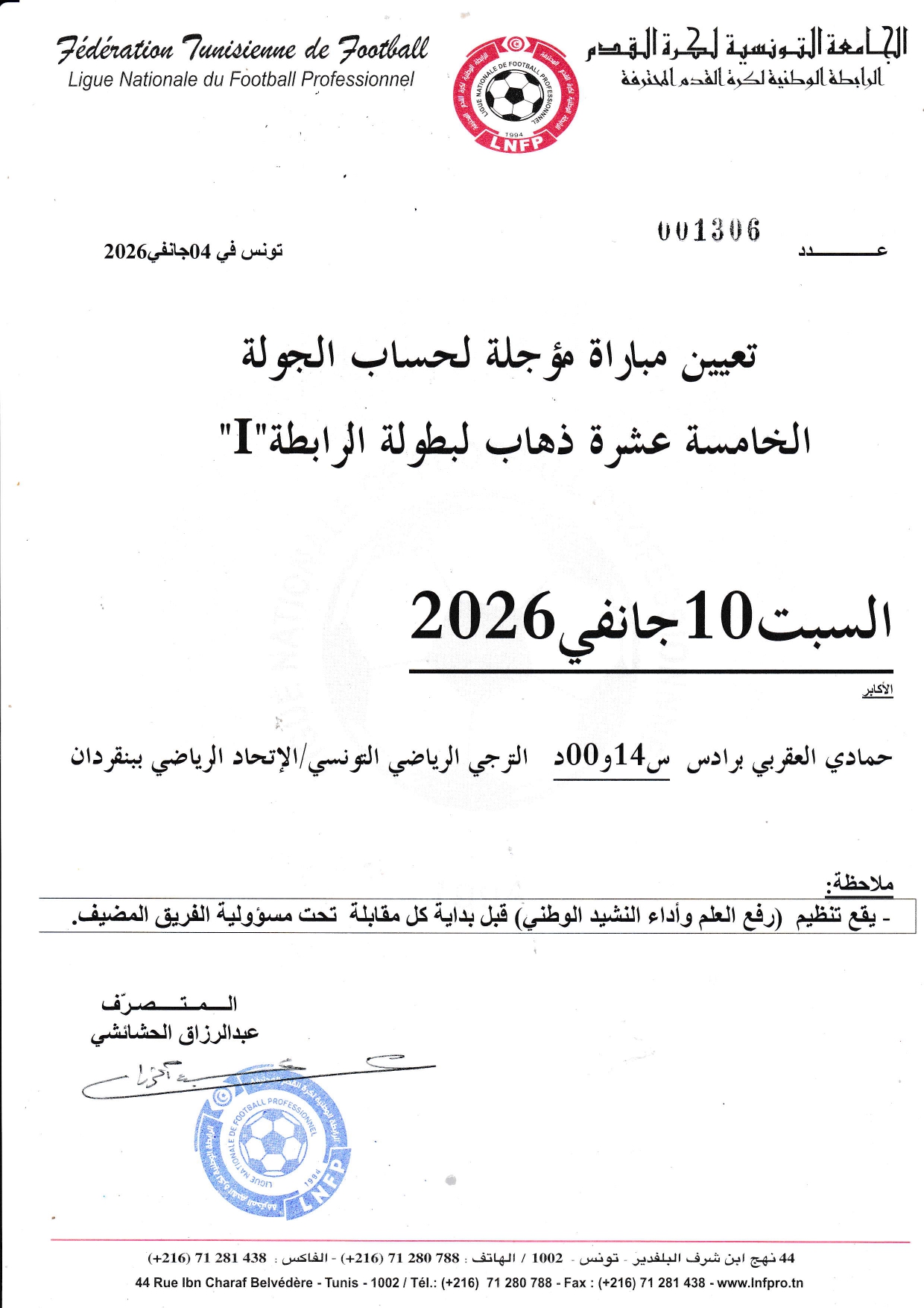 تعيين مباراة مؤجلة لحساب الجولة الخامسة عشرة ذهاب لبطولة الرابطة الأولى