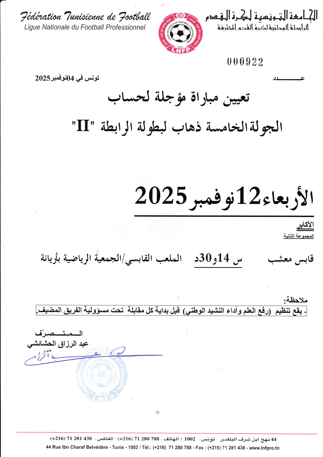 تعيين مباراة مؤجلة لحساب الجولة الخامسة ذهاب لبطولة الرابطة II