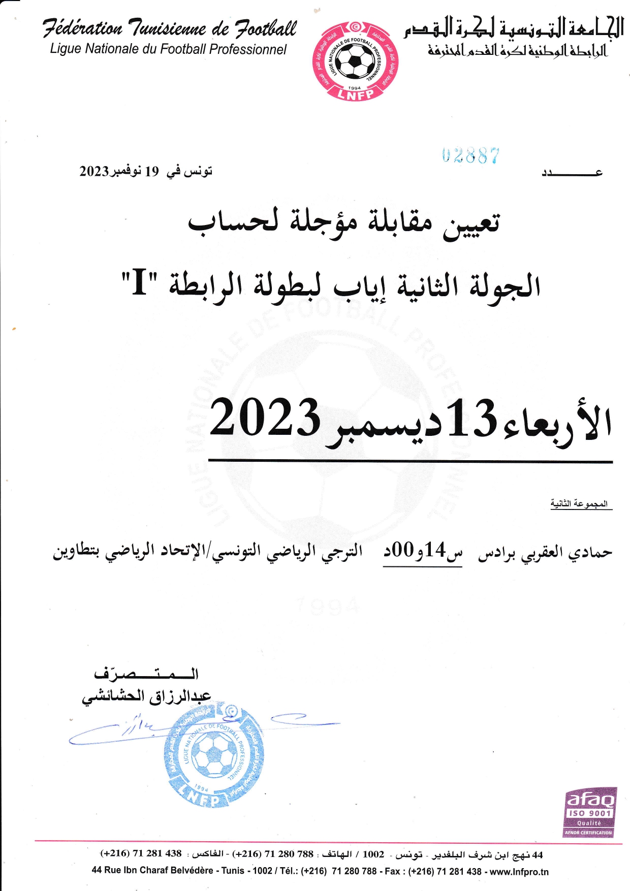 تعيين مقابلة مؤجلة لحساب الجولة 2 إياب لبطولة الرابطة الأولى