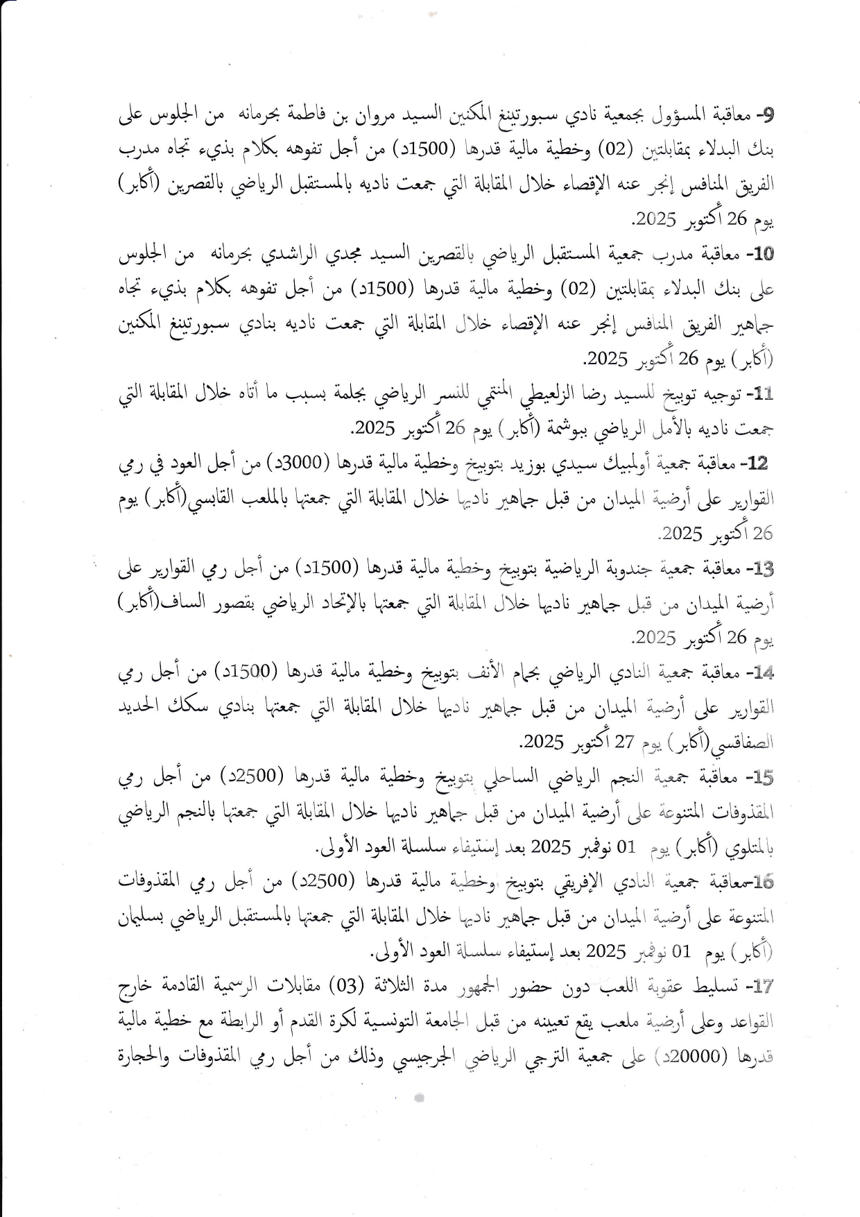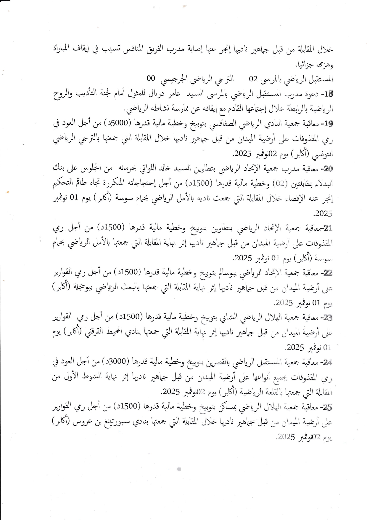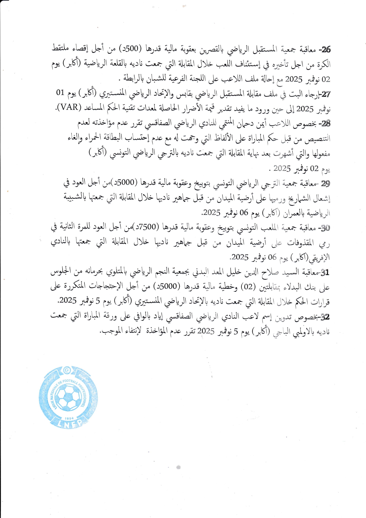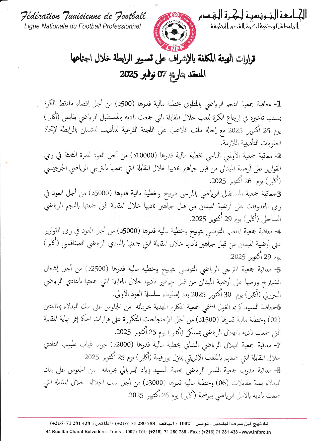 قرارات الهيئة المكلفة بالإشراف على تسيير الرابطة خلال إجتماعها المنعقد بتاريخ 07نوفمبر2025