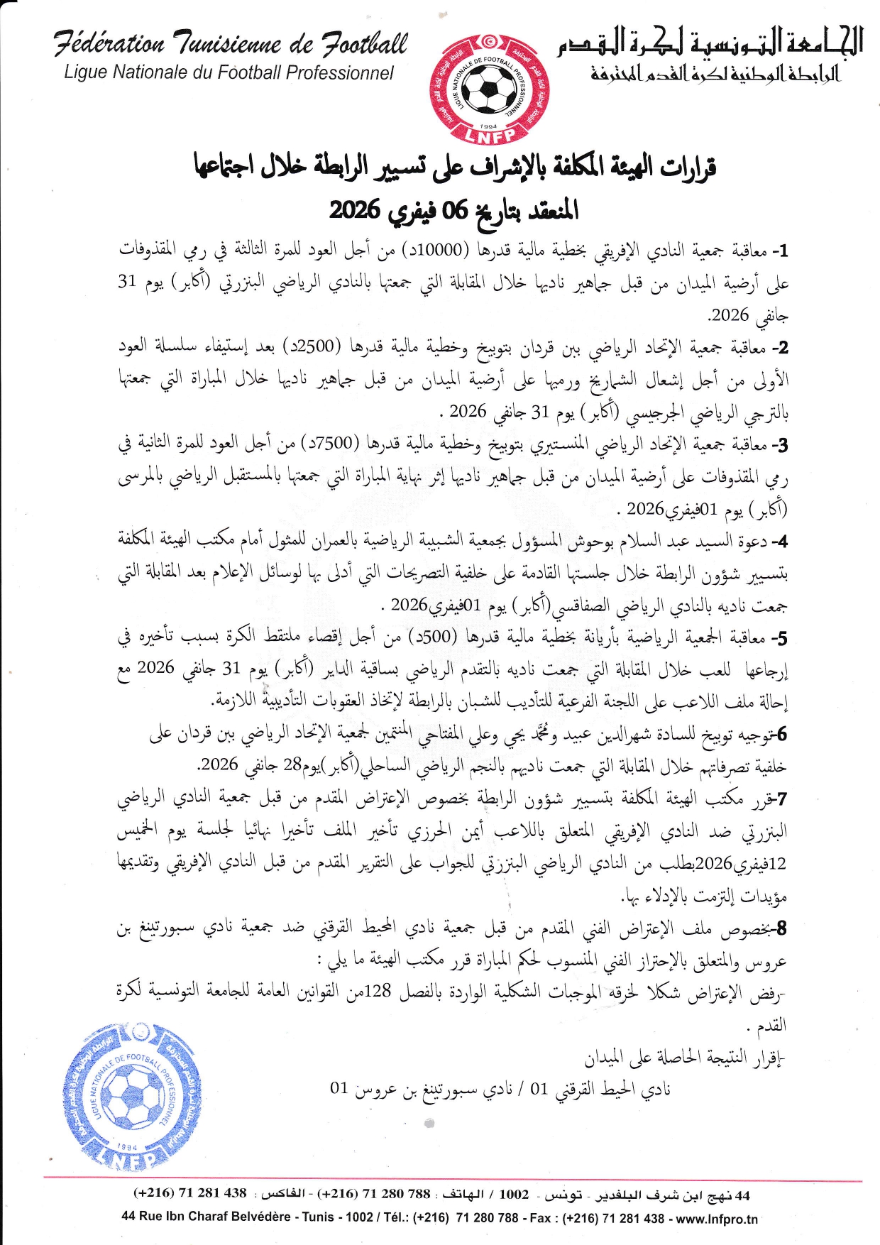 قرارات الهيئة المكلفة بالإشراف على تسييرشؤون الرابطة خلال جلستها المنعقدة بتاريخ 06فيفري2026