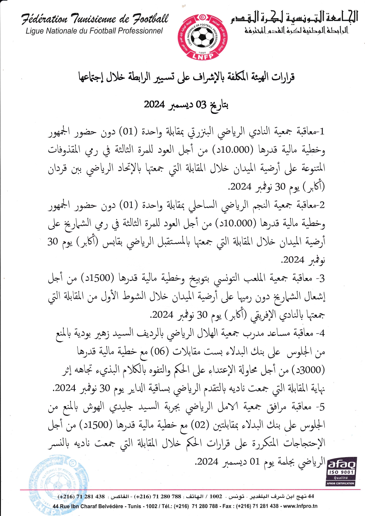 قرارات الهيئة المكلفة بالإشراف على تسيير الرابطة الوطنية لكرة القدم المحترفة خلال إجتماعها المنعقد يوم3ديسمبر2024
