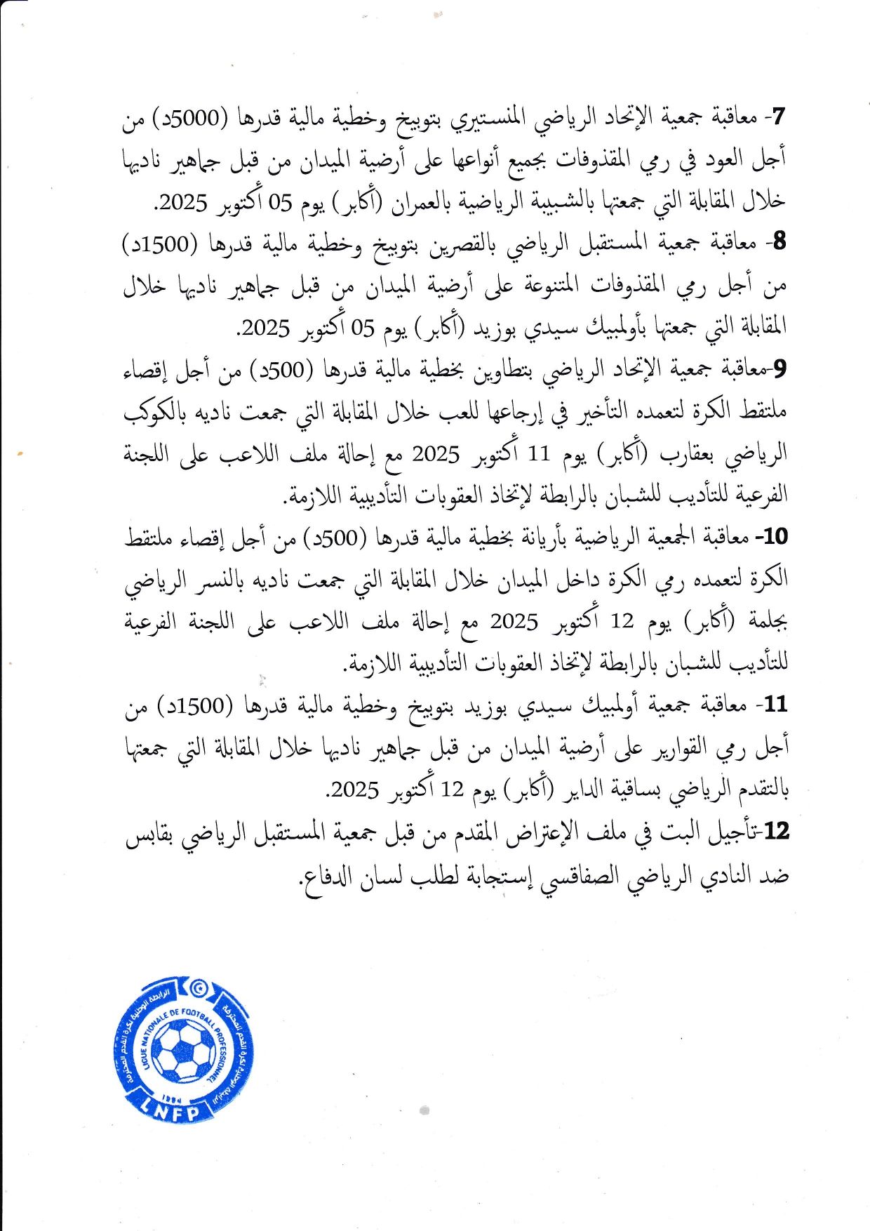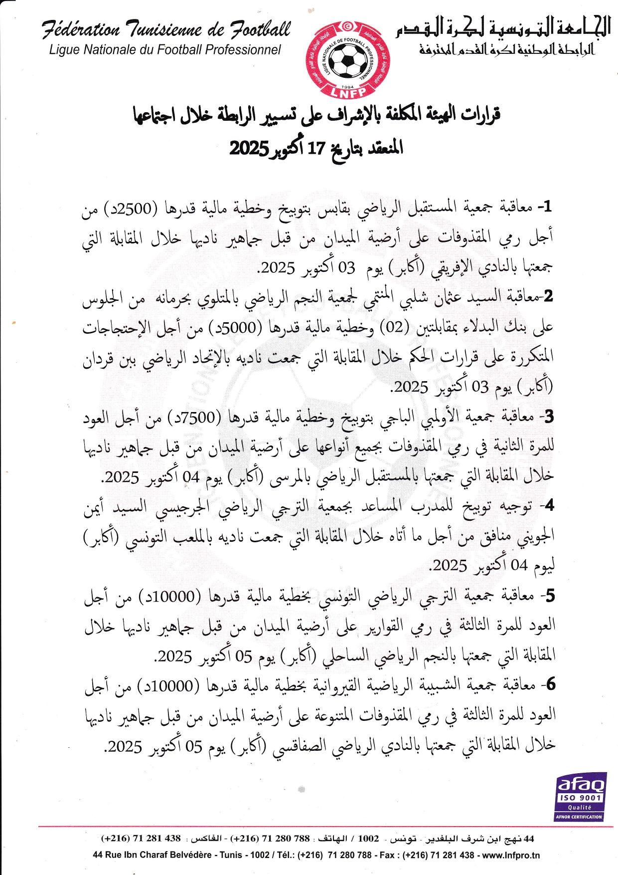 قرارات الهيئة المكلفة بتسيير شؤون الرابطة خلال إجتماعها المنعقد يوم 17أكتوبر2025