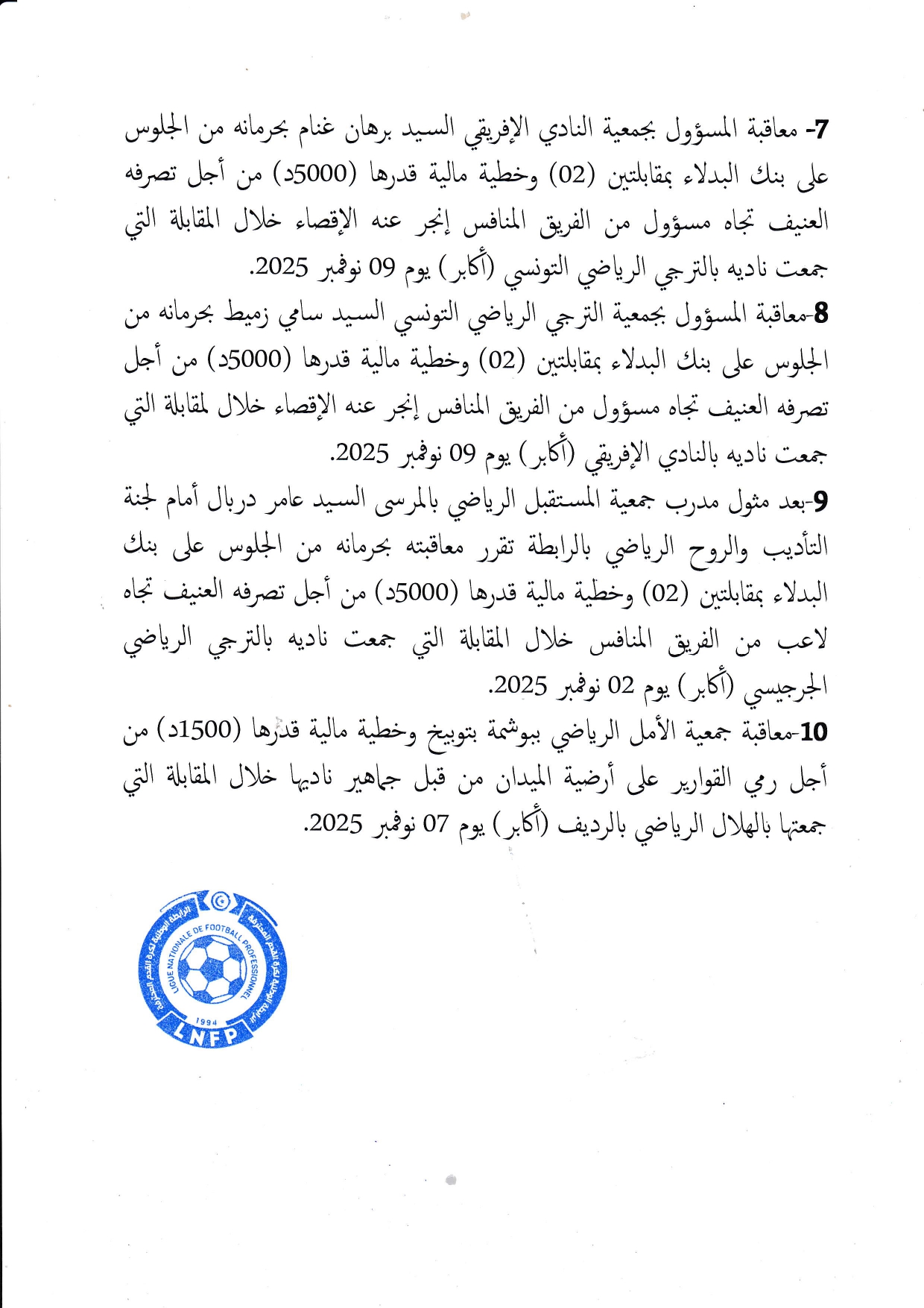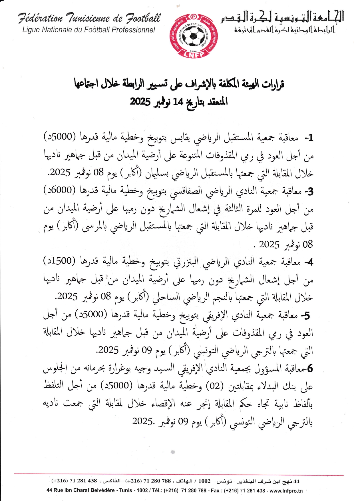 قرارات الهيئة المكلفة بتسيير شؤون الرابطة خلال جلستها المنعقدة بتاريخ 14نوفمبر2025