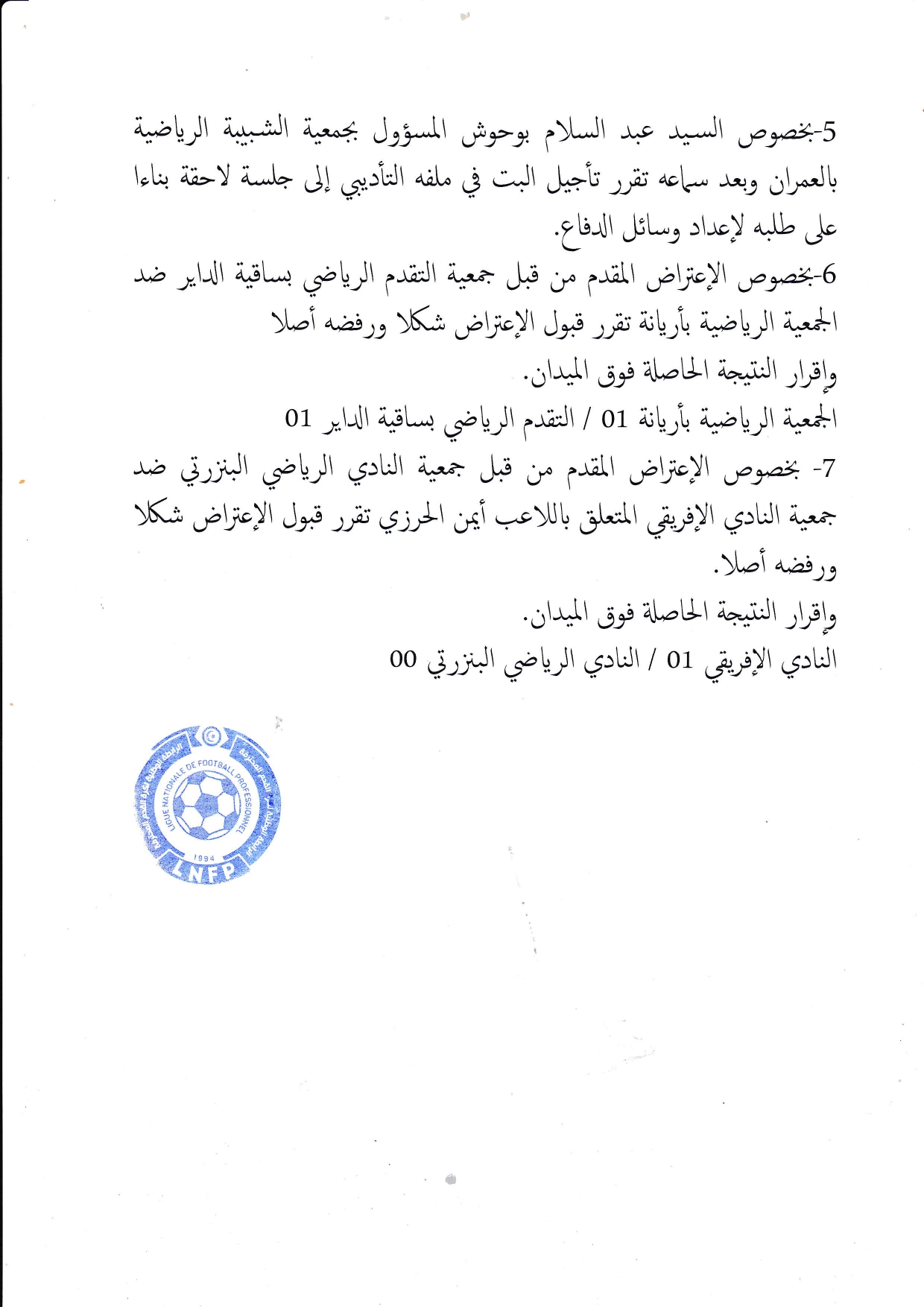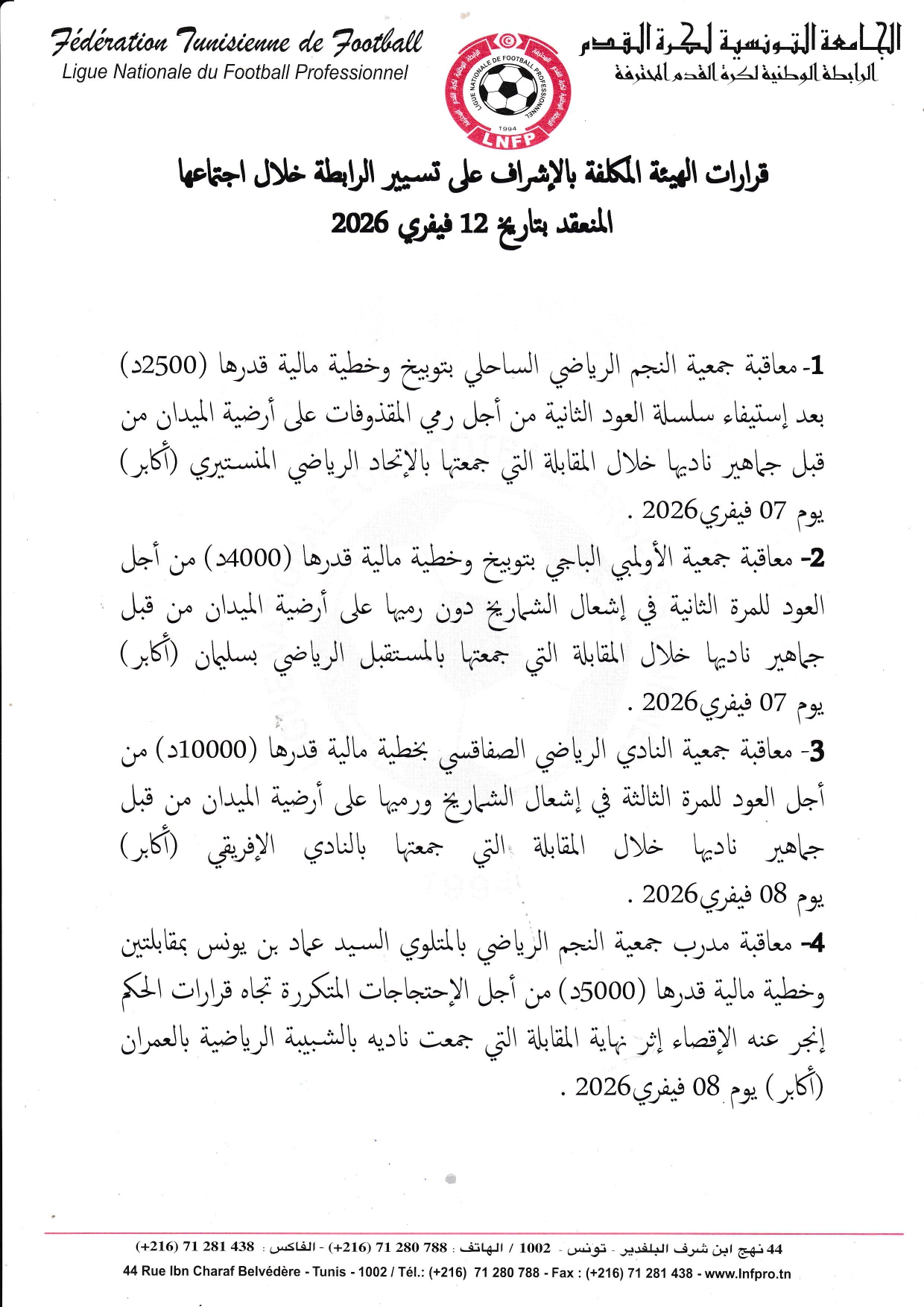 قرارات الهيئة المكلفة بتسيير شؤون الرابطة خلال جلستها المنعقدة بتاريخ 12فيفري2026