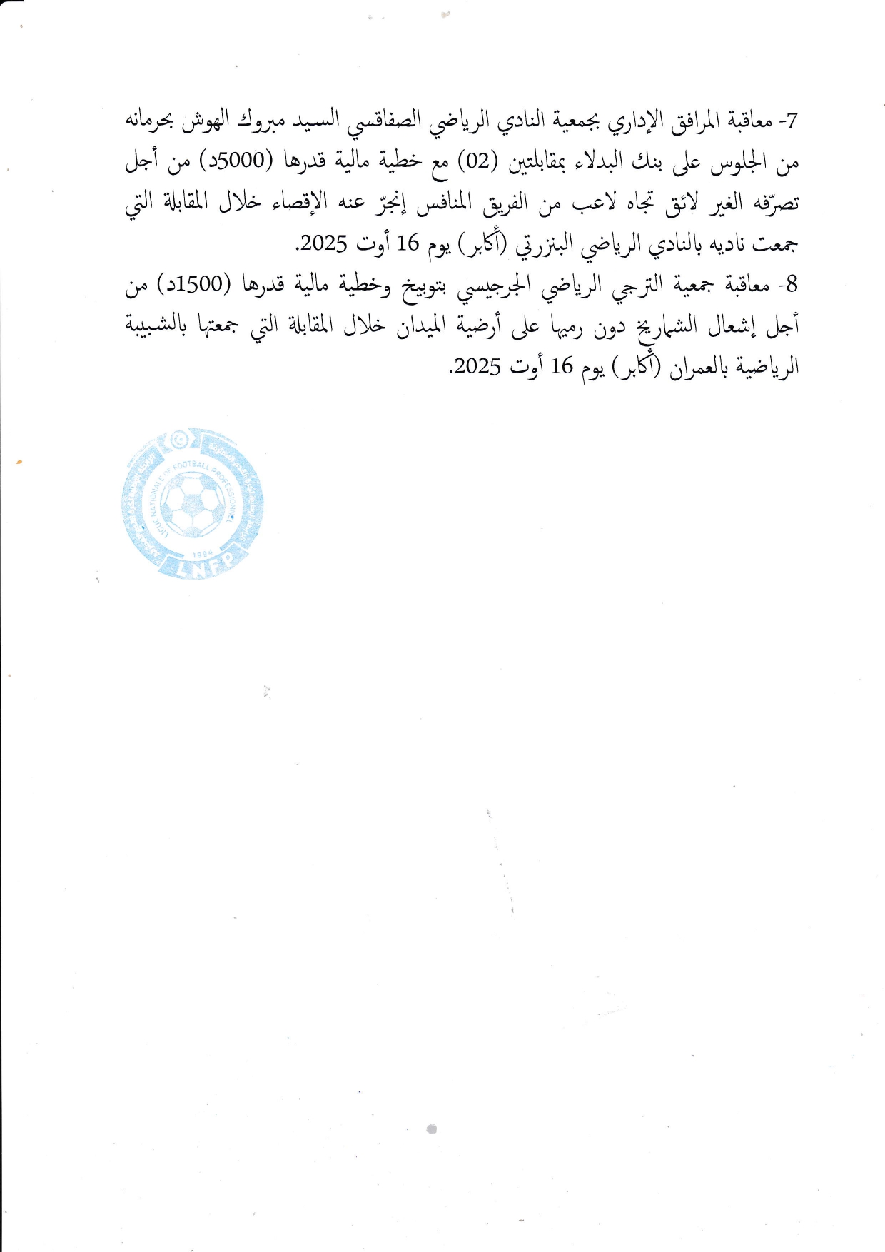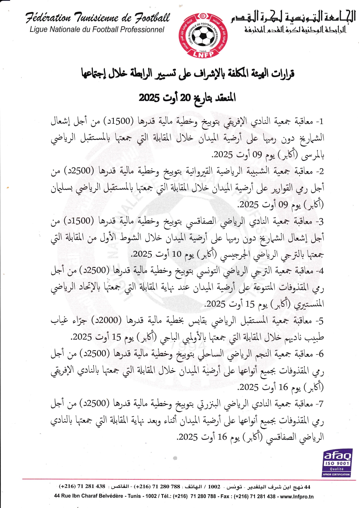قرارات الهيئة المكلفة بتسيير شؤون الرابطة خلال جلستها المنعقدة بتاريخ20أوت2025