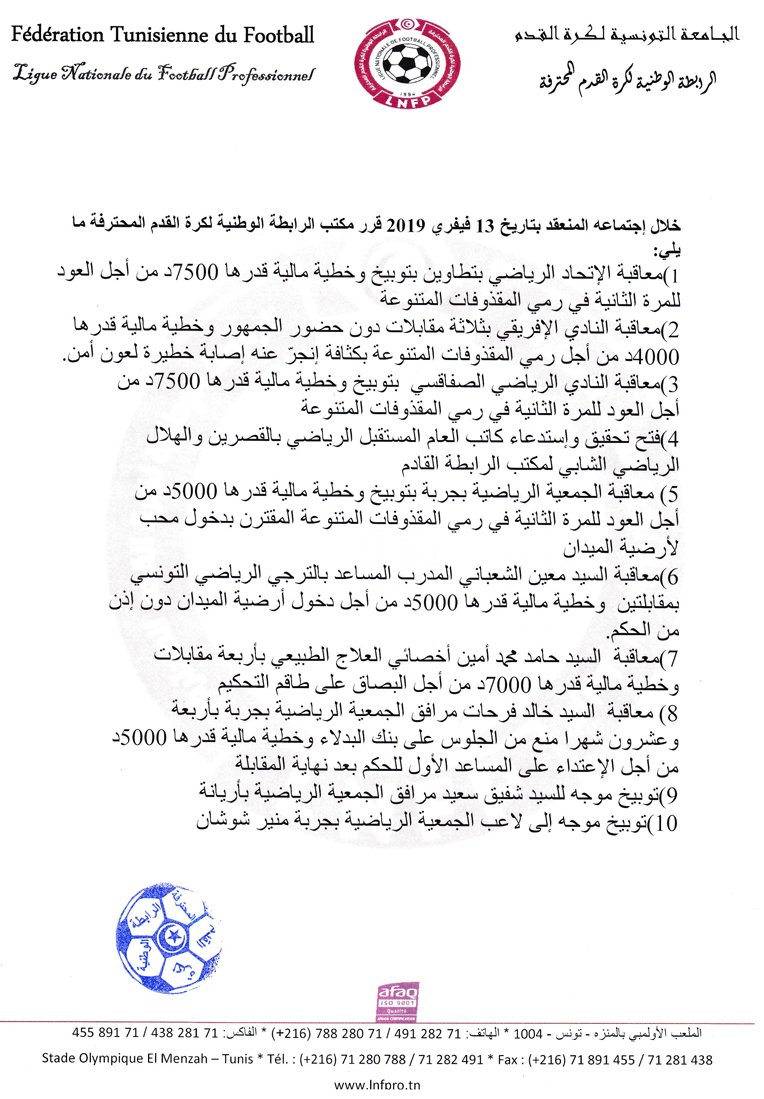 قرارات مكتب الرابطة الوطنية لكرة القدم المحترفة بتاريخ 13 فيفري 2019