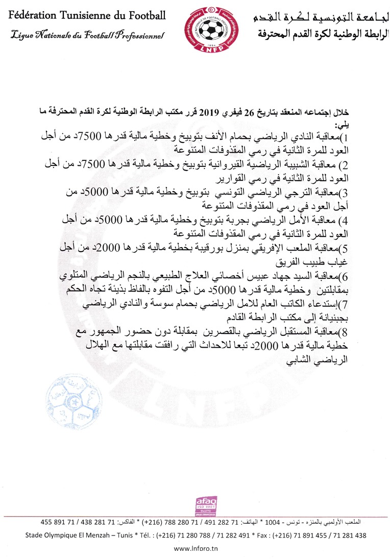 قرارات مكتب الرابطة الوطنية لكرة القدم المحترفة بتاريخ 26 فيفري 2019