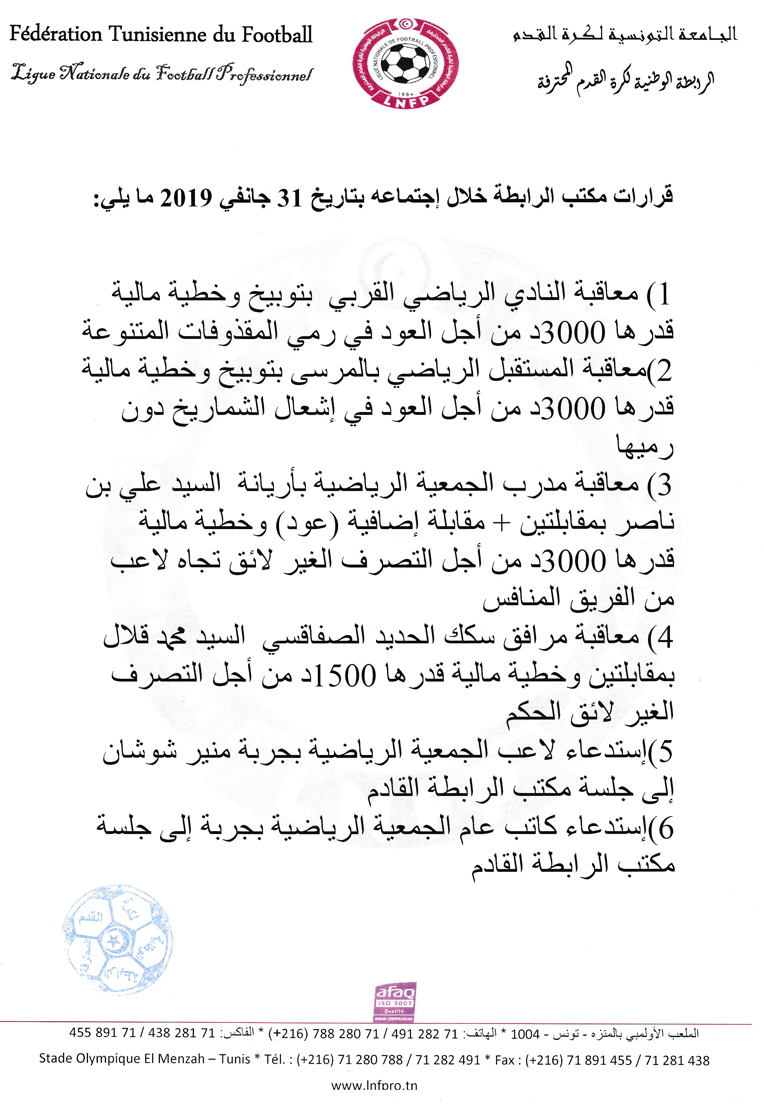 قرارات مكتب الرابطة الوطنية لكرة القدم المحترفة بتاريخ 31 جانفي 2019