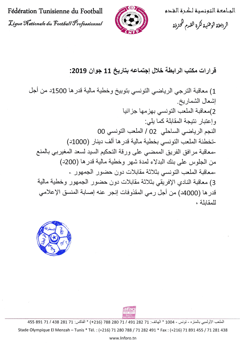 قرارات مكتب الرابطة بتاريخ 06 جوان2019