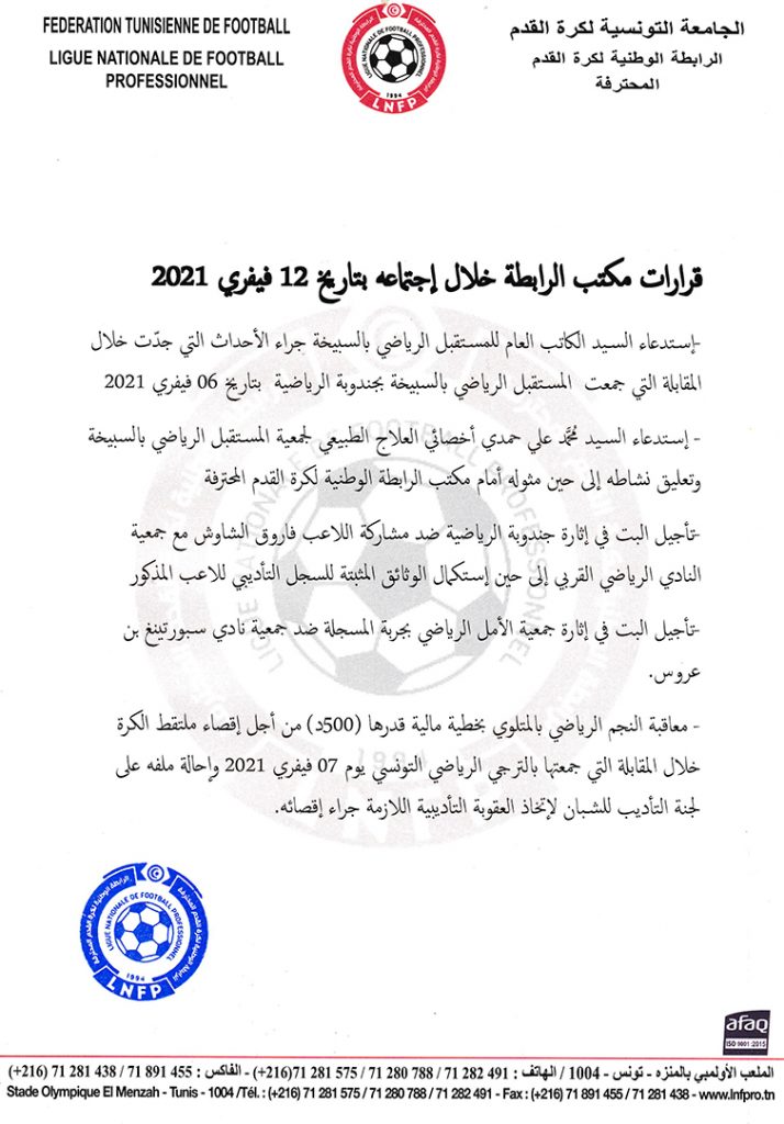 قرارات مكتب الرابطة خلال إجتماعه بتاريخ 12 فيفري 2021