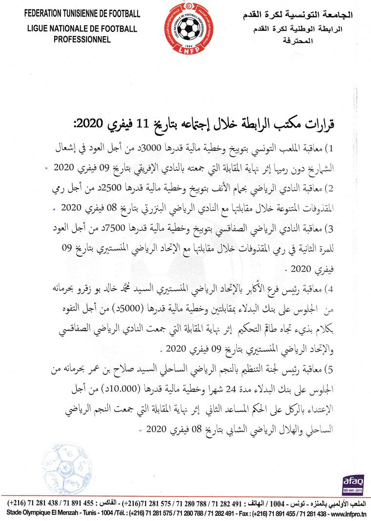 قرارات مكتب الرابطة خلال إجتماعه بتاريخ 11 فيفري 2020