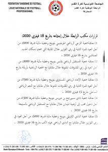 قرارات مكتب الرابطة خلال إجتماعه بتاريخ 18 فيفري 2020