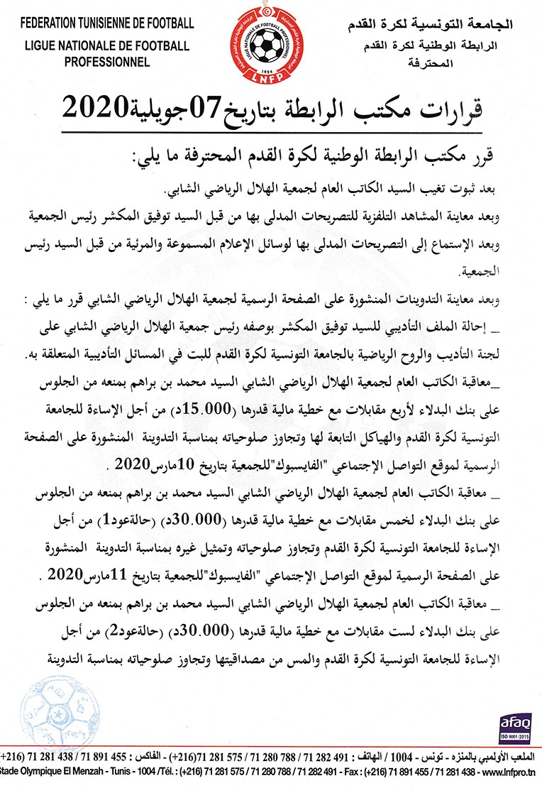 قرارات مكتب الرابطة خلال إجتماعه بتاريخ 07 جويلية 2020