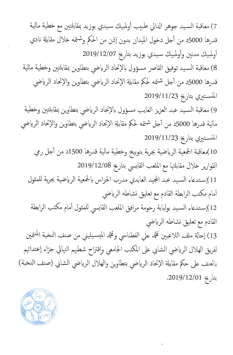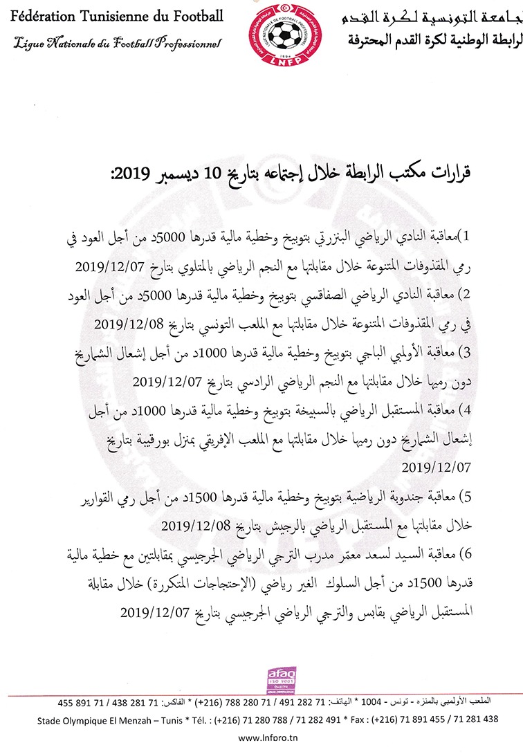 قرارات مكتب الرابطة خلال اجتماعه بتاريخ 10 ديسمبر 2019