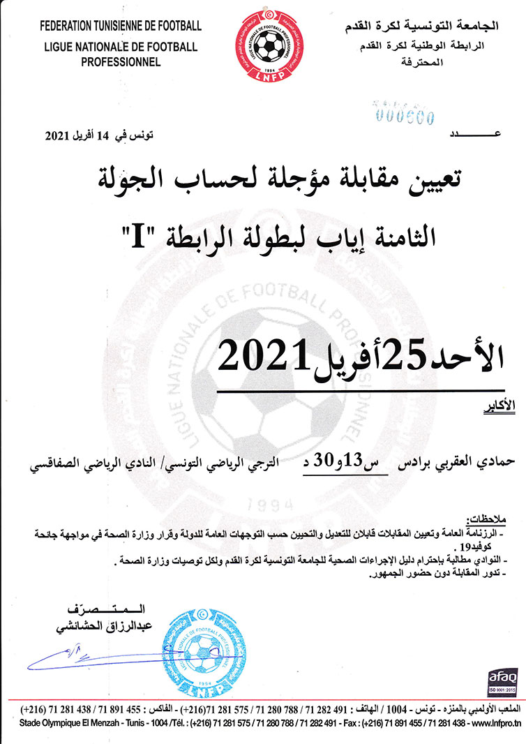 1 تعيين مباراة مؤجلة لحساب الجولة الثامنة إياب لبطولة الرابطة