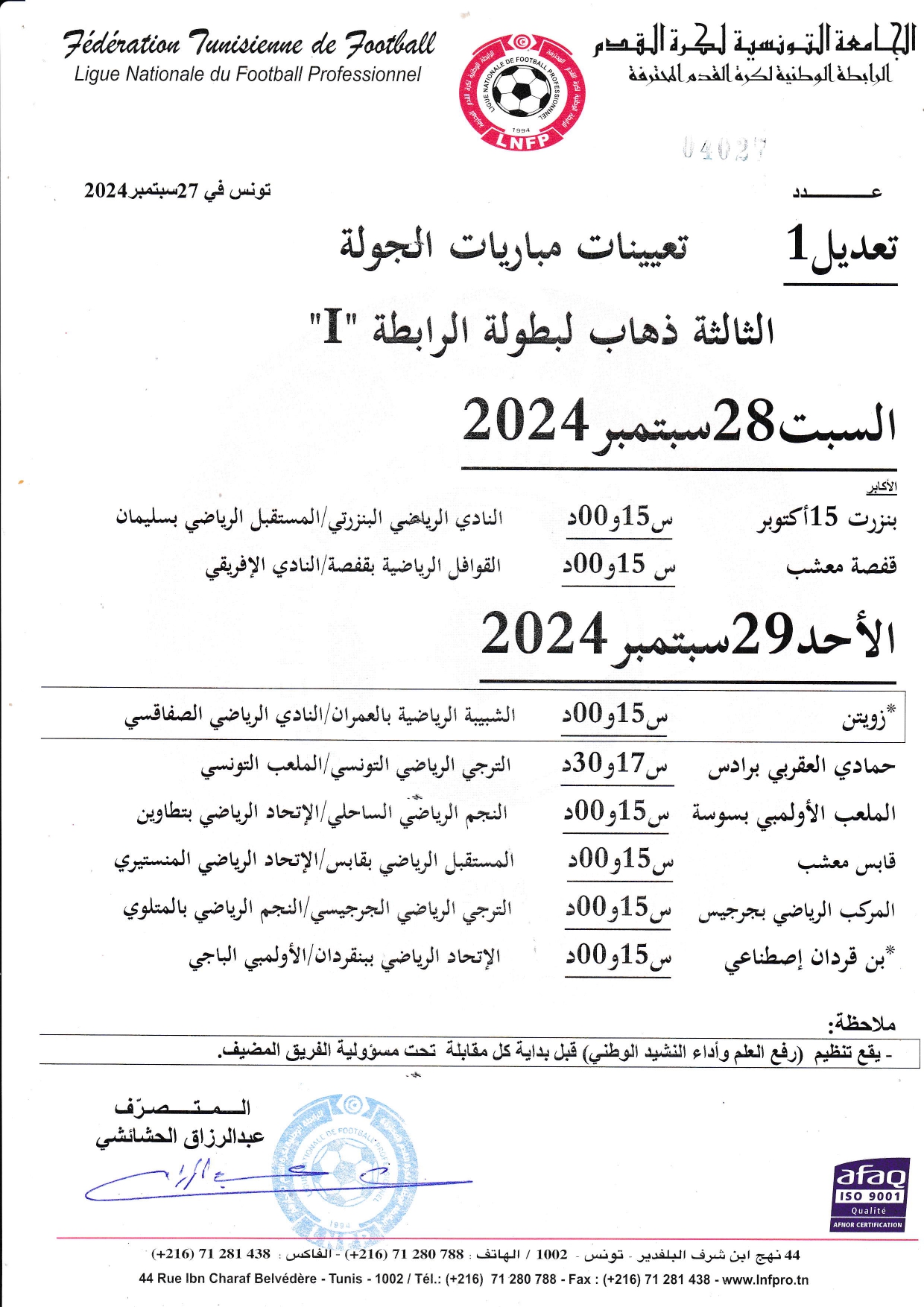 تعديل تعيينات مباريات الجولة 9 ذهاب لبطولة الرابطة « I »
