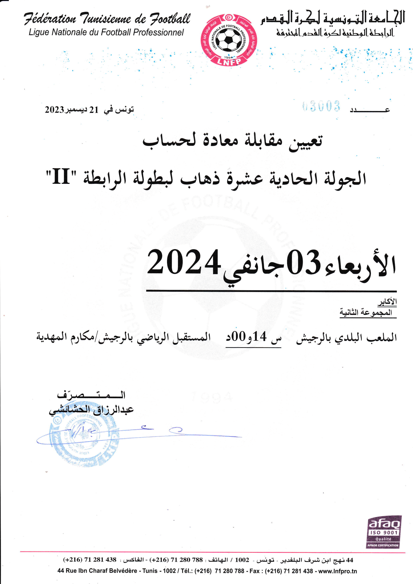 2 تعيين مقابلة معادة لحساب الجولة الحادية عشرة ذهاب لبطولة الرابطة