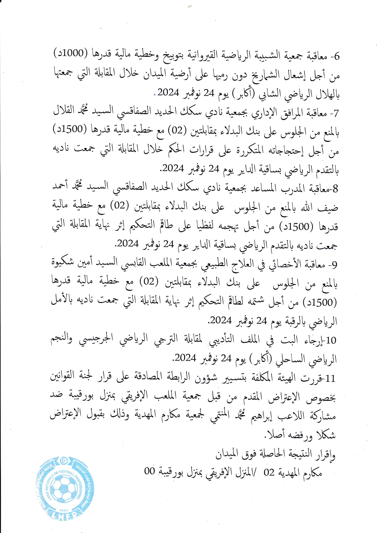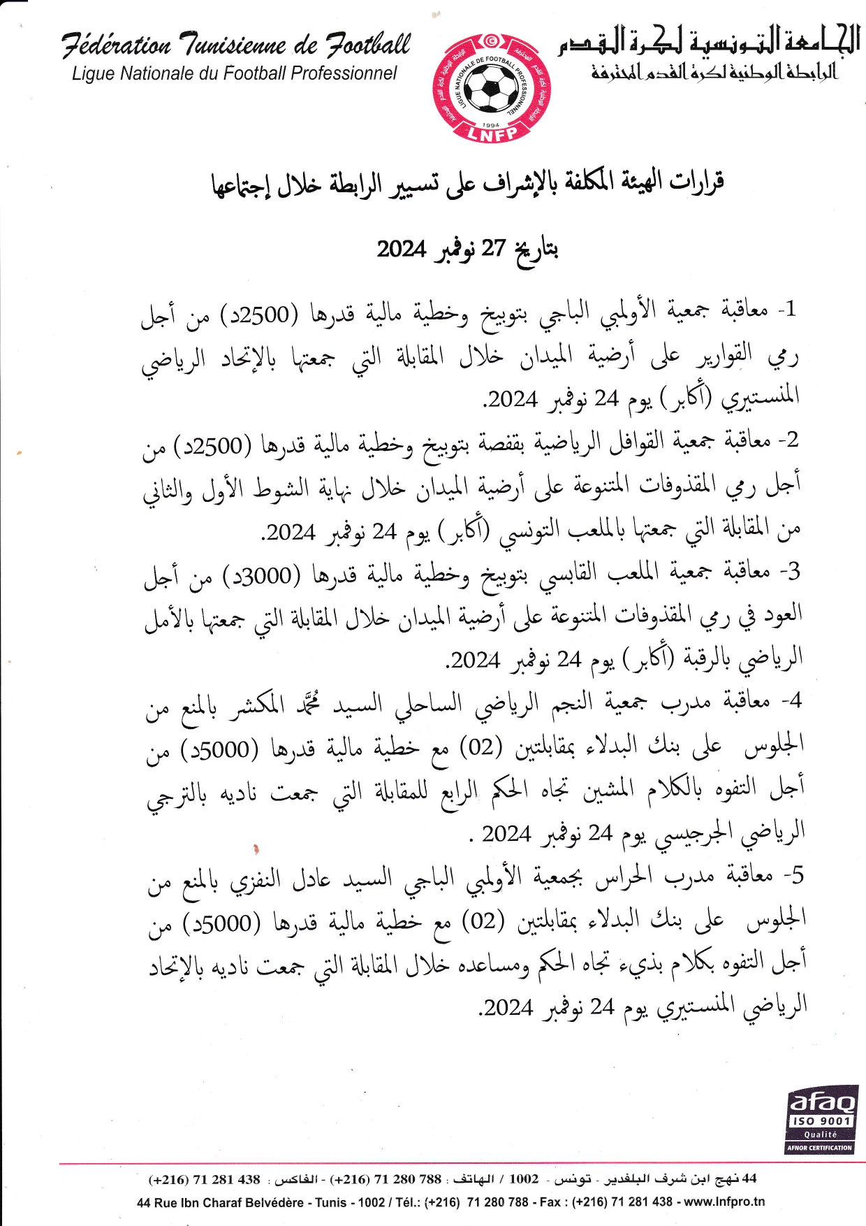 27/10/2024 قرارات اللجنة المكلفة بتسيير الرابطة