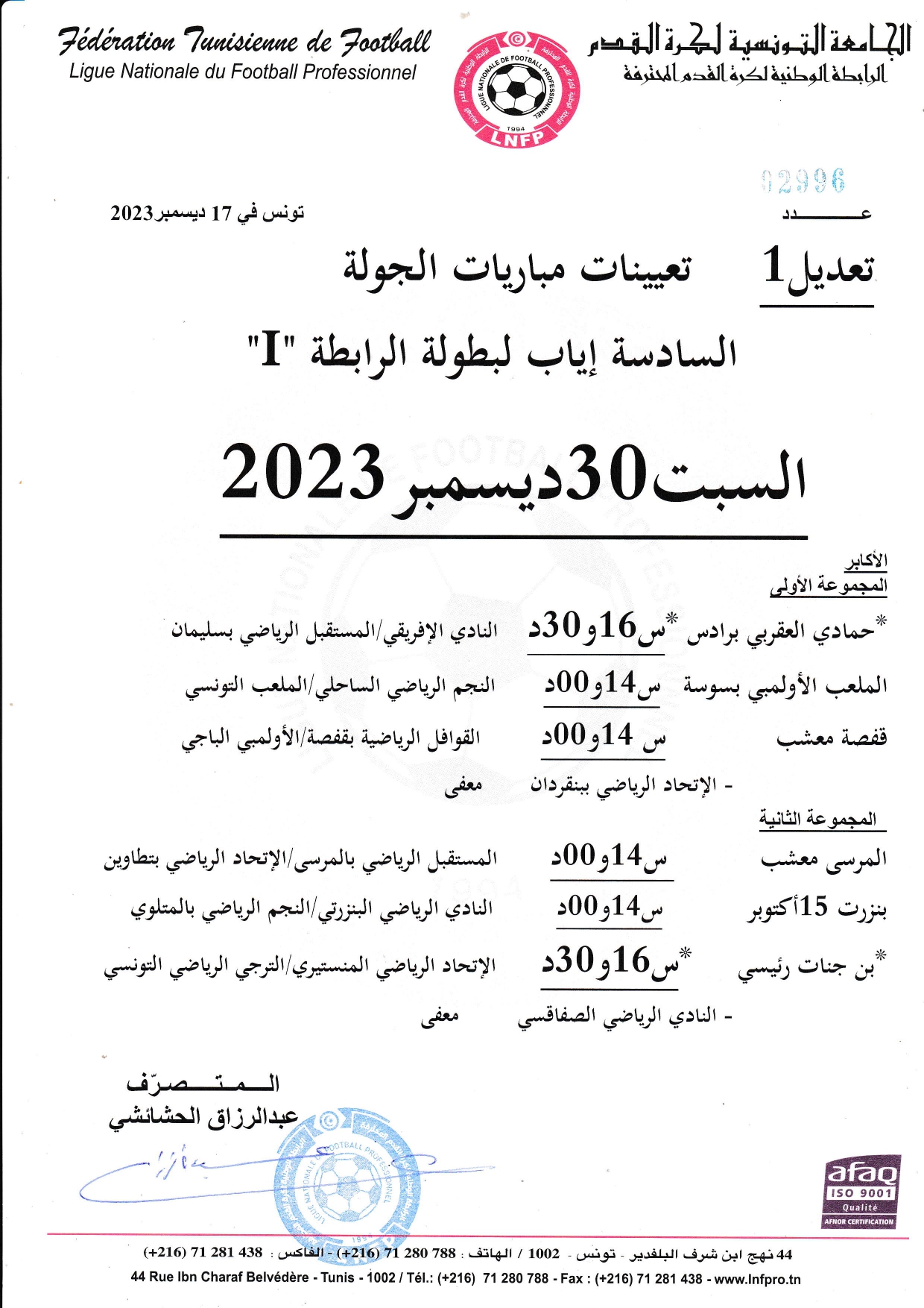 تعديل تعيينات مباريات الجولة 9 ذهاب لبطولة الرابطة « I »