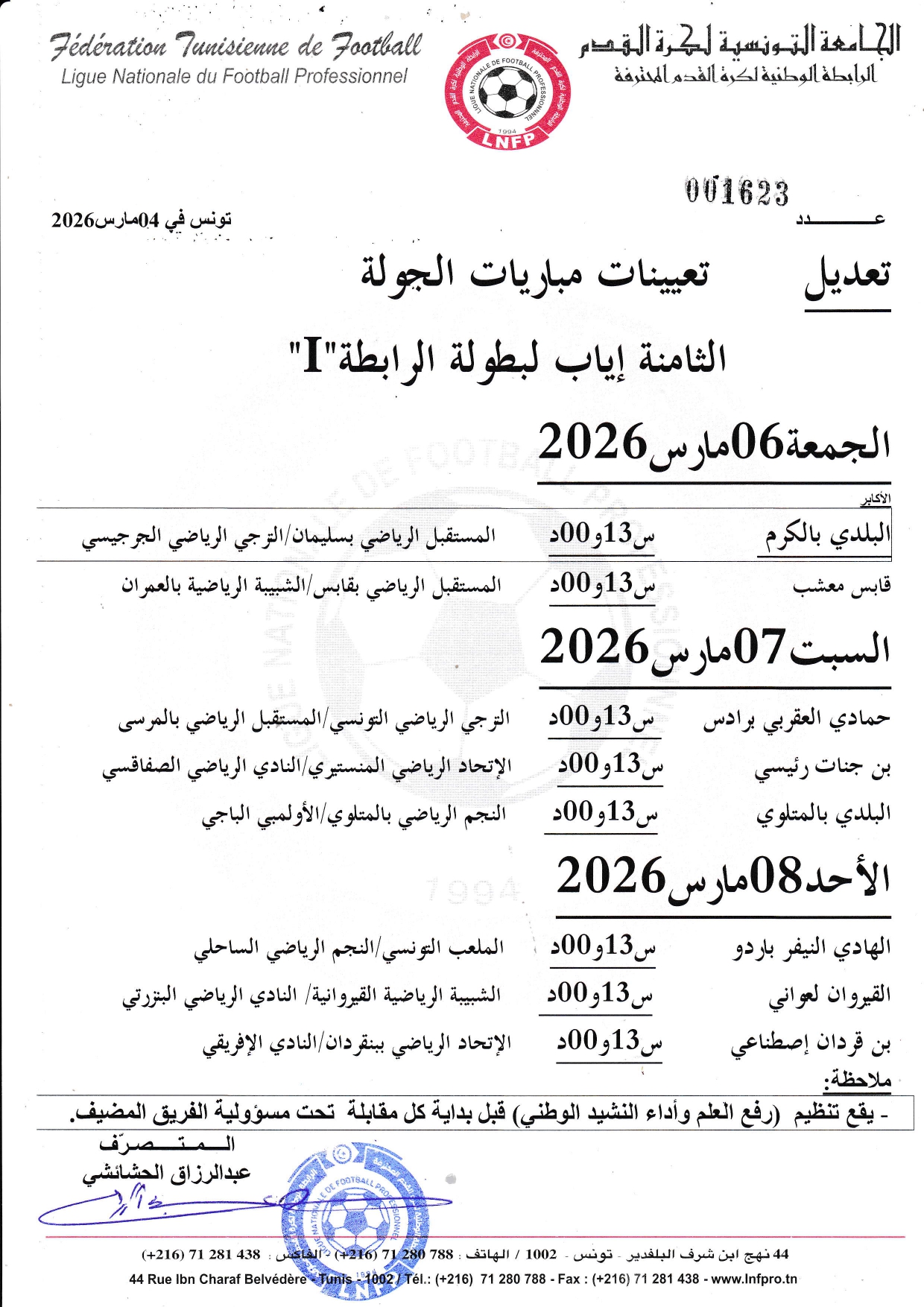 « i »تعيينات مباريات الجولة الثامنة إياب لبطولة الرابطة