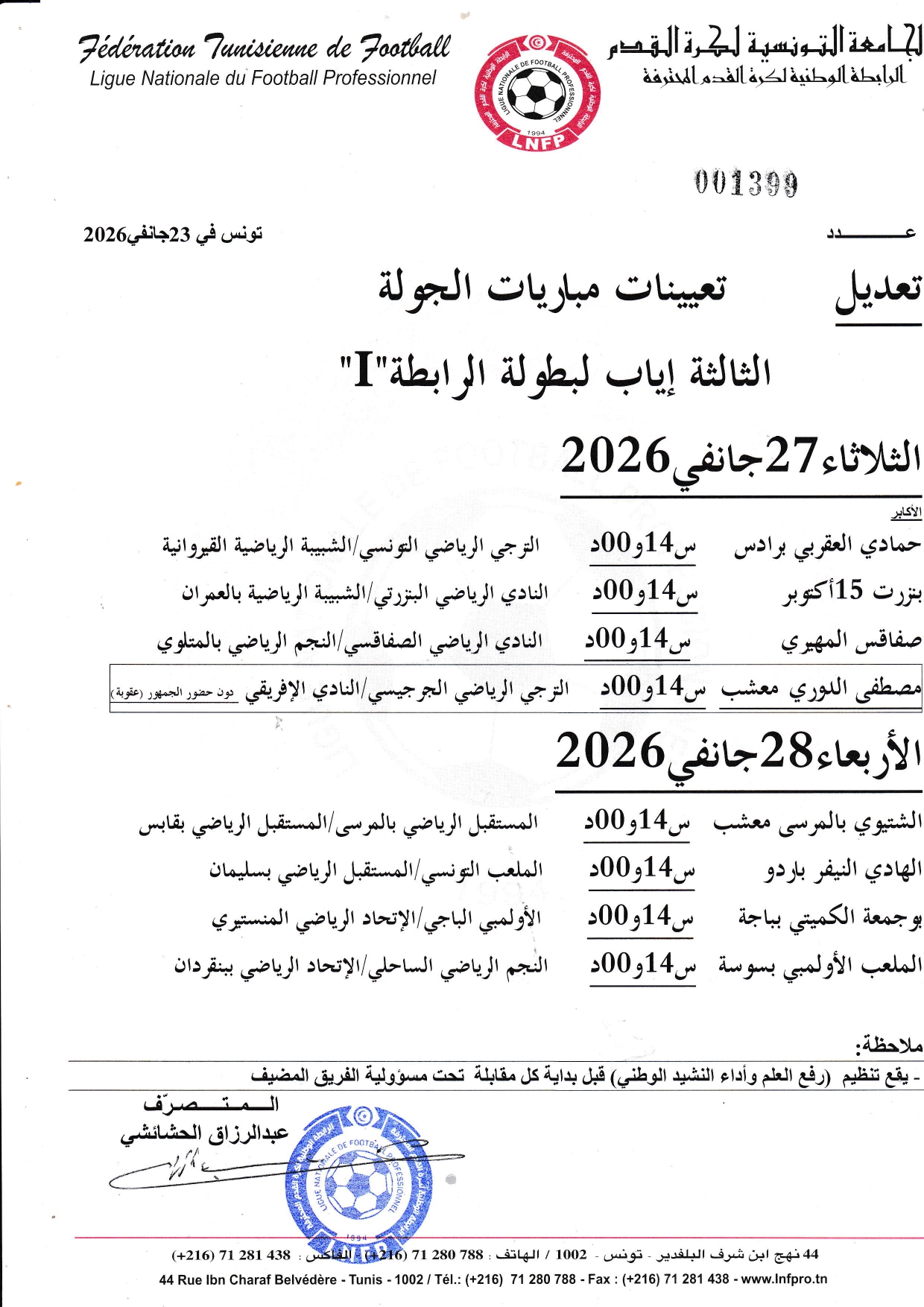 I تعديل تعيينات مباريات الجولة الثالثة إياب لبطولة الرابطة