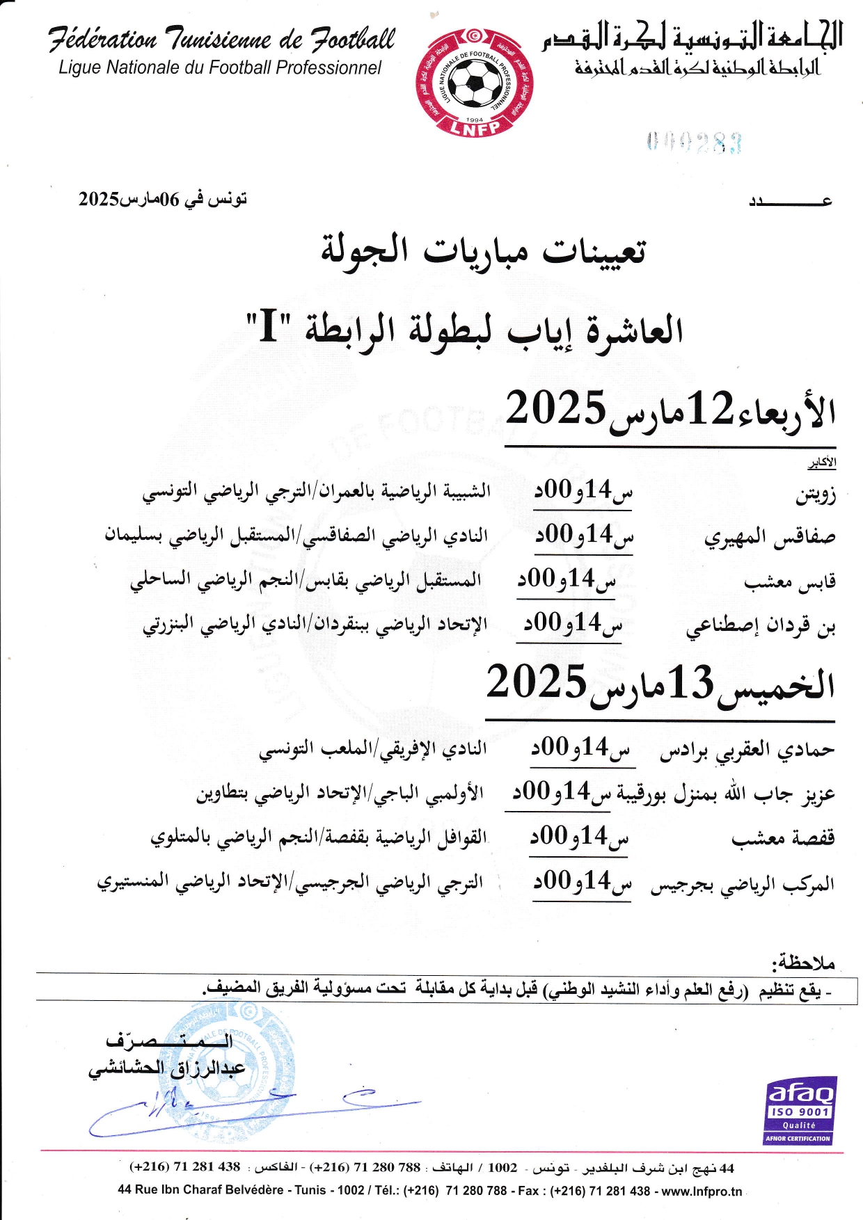 تعديل تعيينات مباريات الجولة 9 ذهاب لبطولة الرابطة « I »